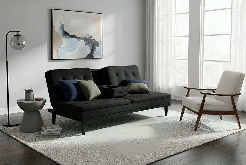 Product Description: This classic sofa bed combines style and functionality. Itfeatures a sleek design with plush upholstery, making it aperfect addition to any living space. MaterialTop grain fabric and leatherette, high densityfoam, high-pressure sofa bed mechanism Dimensions 73” W x...